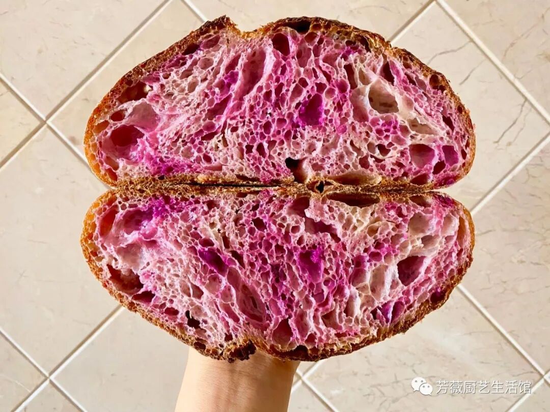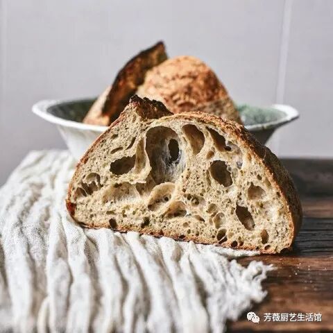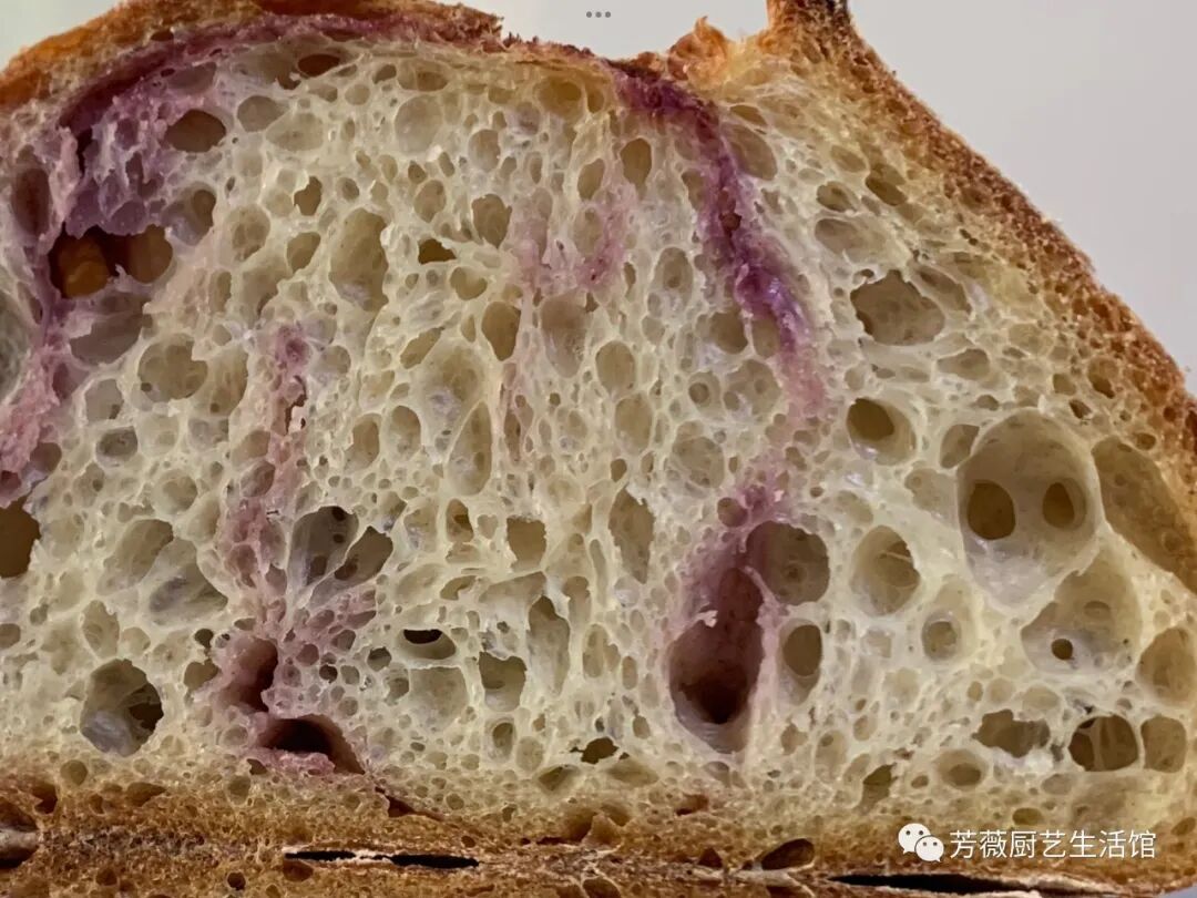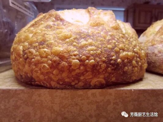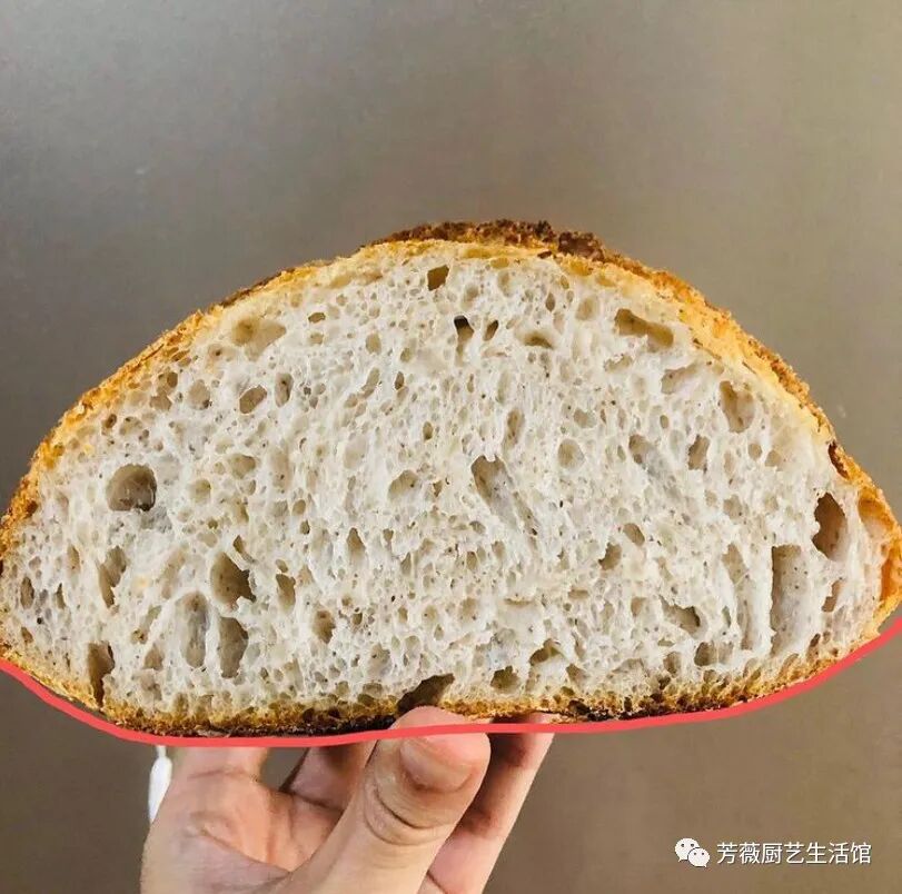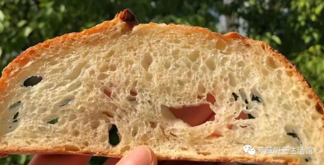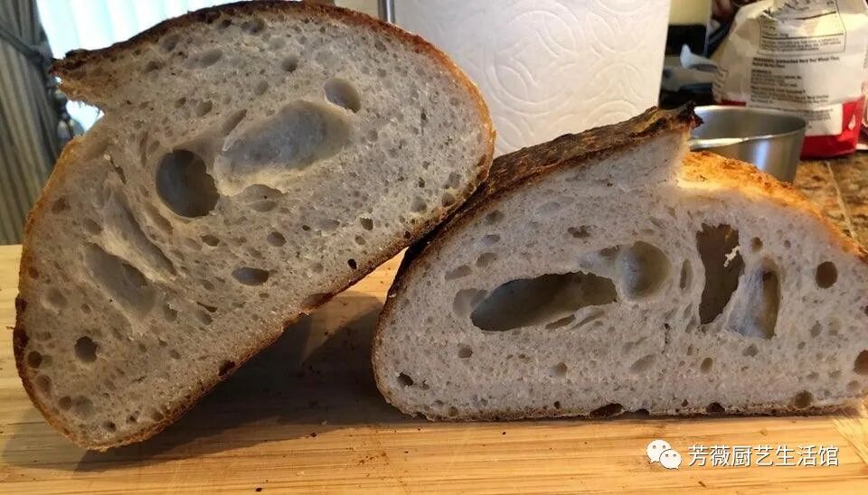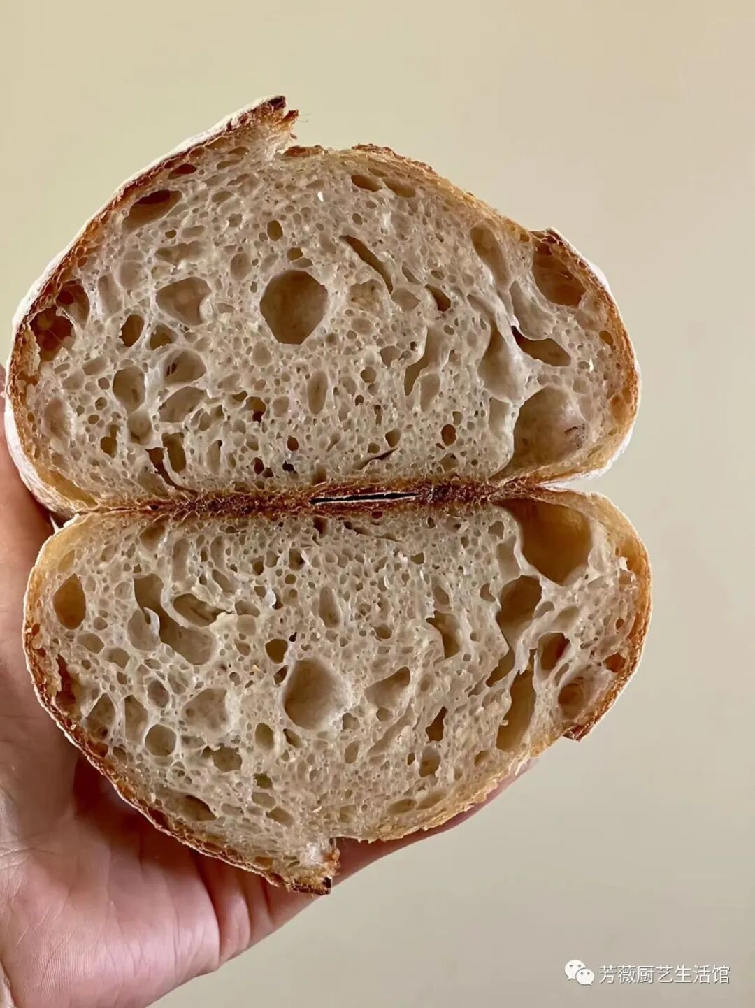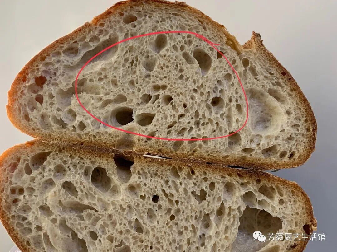 当最外面那一层的面筋变得脆弱,气体就会容易跑出来。而酵种一方面因为是酸性物质,会腐蚀面筋,另一方面它做的面团会比商酵发的慢很多(酶产生了水合作用),所以它做的成品表皮上会比较容易出现这样的特征。