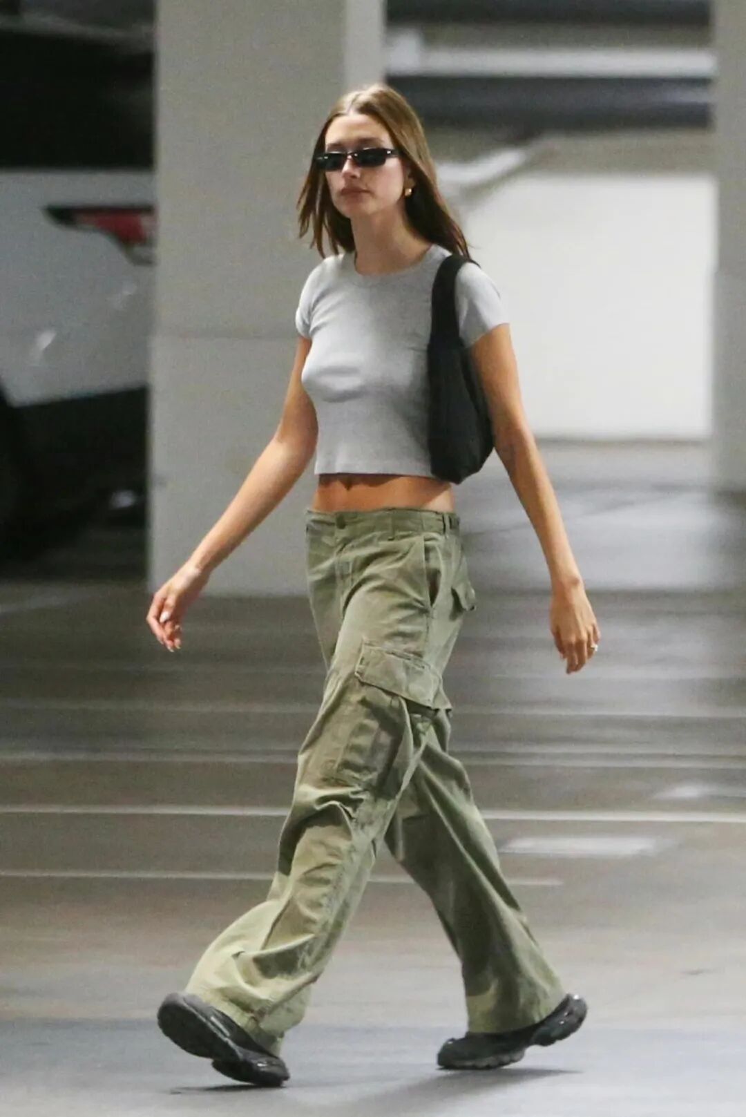 你看Hailey最爱的紧身背心、短Tee,配中低腰阔腿牛仔裤、工装裤的穿法,拆解开来都是千禧年流行过的,但把色彩一“收”,整个调性就变得日常起来。![]()