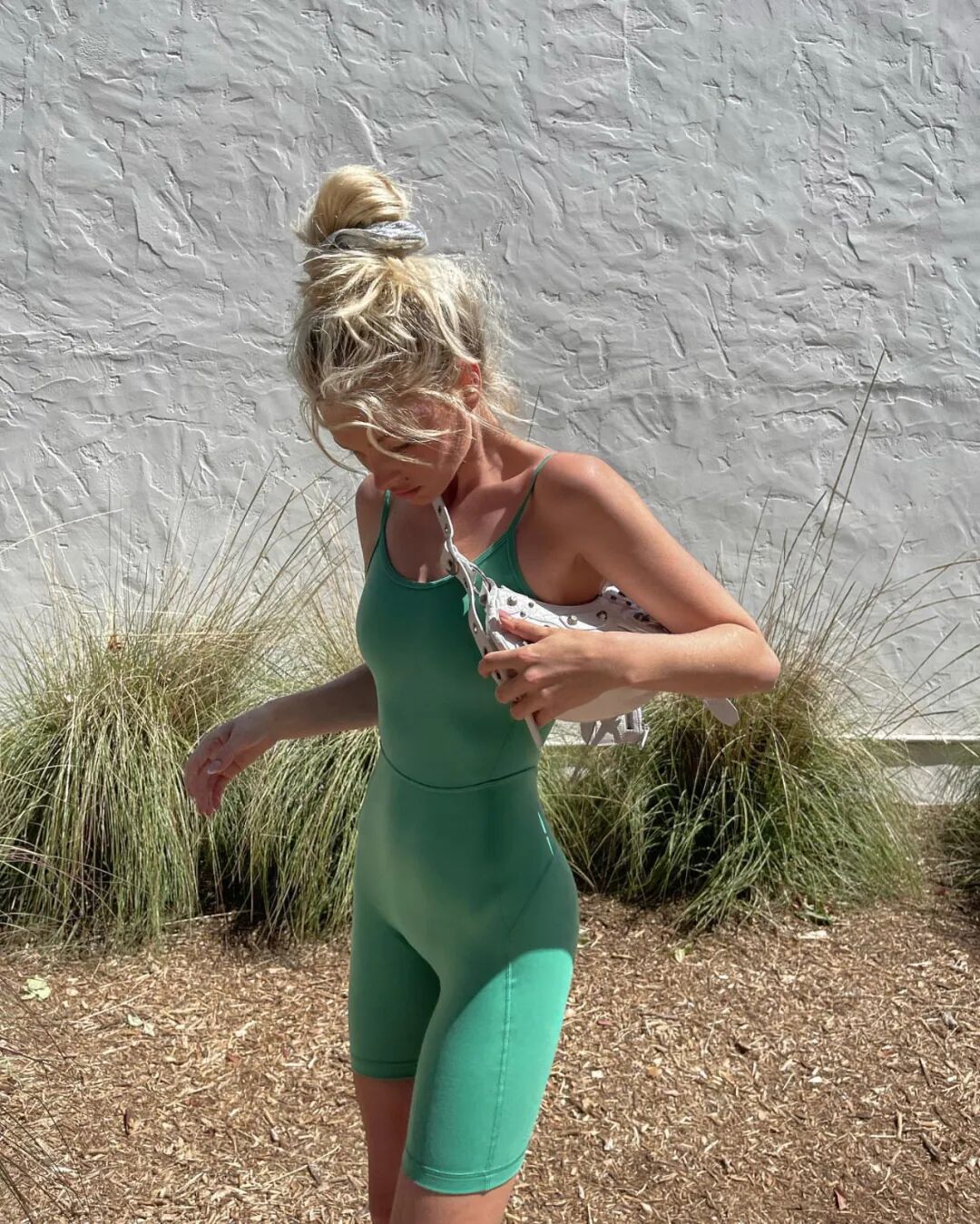 Elsa Hosk前阵子穿了身超好看的牛油果绿色瑜伽服,紧身吊带+高腰中裤非常显身材,却不适合直接穿出门