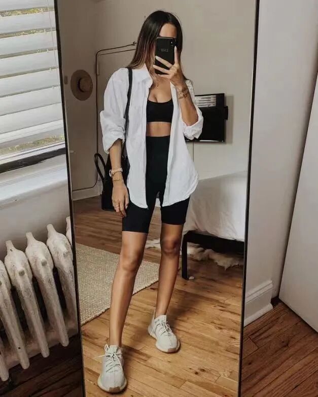 除了卫衣,男友风衬衫也是很好穿的“外套”。宽松洒落的版型,不像商务衬衫那么一本正经,又比卫衣要讲究,还能与健身套装搭出一种反差的时髦感。![]()