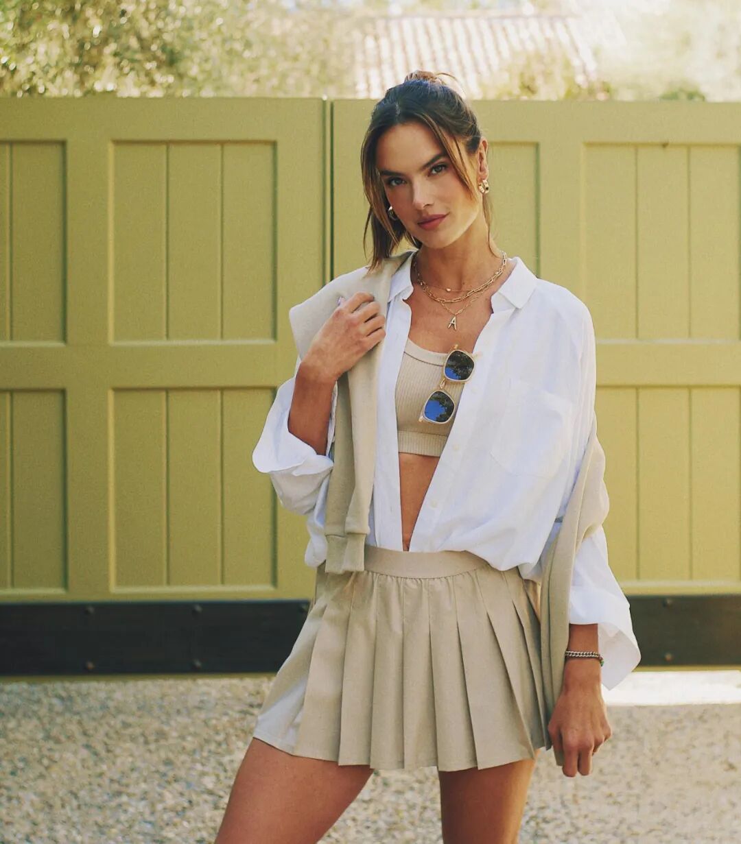 有被这一身惊喜到~!文胸、卫衣和网球裙都属于Athleisure风格单品,AA聪明地选择同色系,让单品之间能更好地搭配、相融;白衬衫的混入,看似“打破”,实则让整个造型更有层次,轻松休闲与运动活力在穿搭中层层递进,也更适合姐姐的年纪。![]()