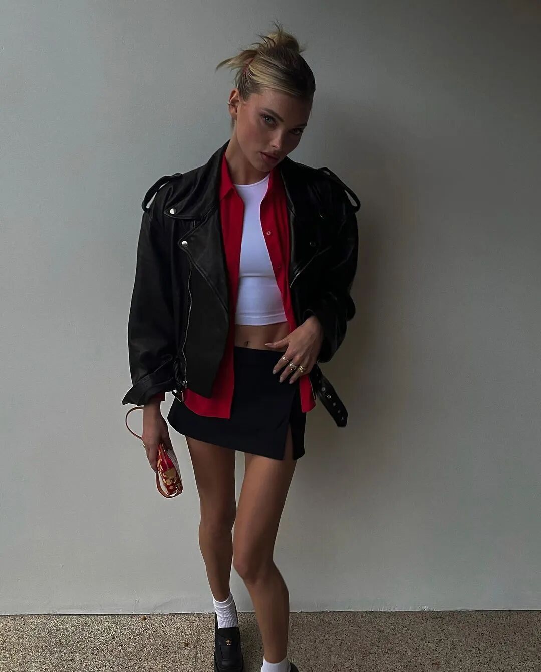 当皮衣这种“硬核”单品出现的时候,Sophia会利用透视针织衫塑造材质间的对比,鞋子则用了“人畜无害”的芭蕾舞鞋为整体卸力。