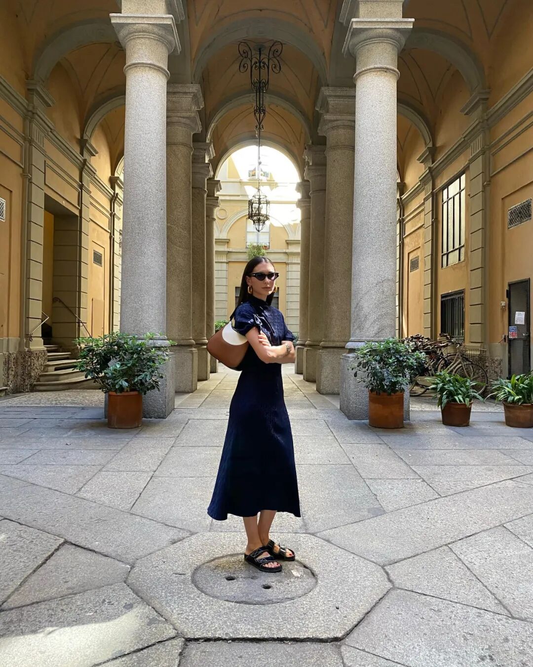 她的日常风格也是偏简约的那种,不过多了一点意大利女人的别样气质。比如,她会给米色针织套装搭配勃肯鞋这种出名的“丑鞋”(意大利女人真的很爱丑鞋)。