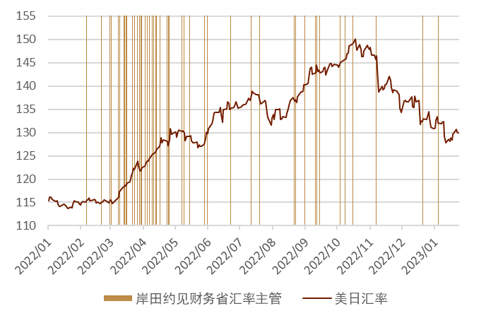 汇率是两种货币的相互交换比率,汇率的话题自动会涉及外交,日本的政治家很少就汇率问题公开发表相关观点。但是从岸田的活动中,我们可以发现2022年岸田对日元大幅贬值的担心。日本的主流媒体会公布日本首相每天的所有行程(包括具体的时间、地点、人物),因此我们可以从公开信息中掌握首相每天的动向。图表7中的黄色竖线标明了自2022年以来岸田首相约见财务省汇率主管神田真人(KANDA Masato)的日子,我们发现在日元发生大幅贬值的2022年3-4月以及9-10月时期,岸田高频约见汇率主管,听其对汇率做出汇报;但相反,当汇率比较平稳(2022年8月左右)或日元汇率恢复走强时(2022年11月以来),岸田约见汇率主管的频率有了明显放缓。基于汇率走势与岸田约见汇率主管的频率来看,我们认为岸田对日元的大幅贬值存在担心,而日元大幅贬值的主要因素之一来自于日本央行过于宽松的货币政策态度。