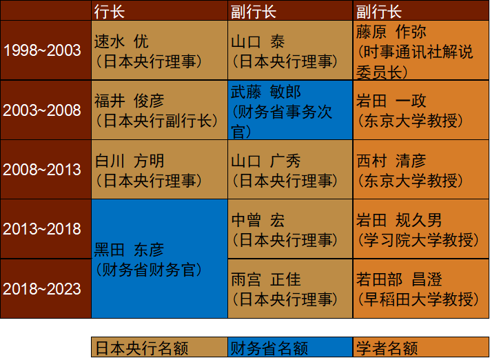 图表13展示了自1998年新《日本央行法》实施后的5届日本央行正副行长搭配。一般情况下行长与其中一位副行长分别由日本央行与财务省出身人士分别担任,另一位副行长由学者背景的人士担任。由于新行长大概率从日本央行人士中产生,我们认为其中一名副行长大概率从财务省出身人士中产生。