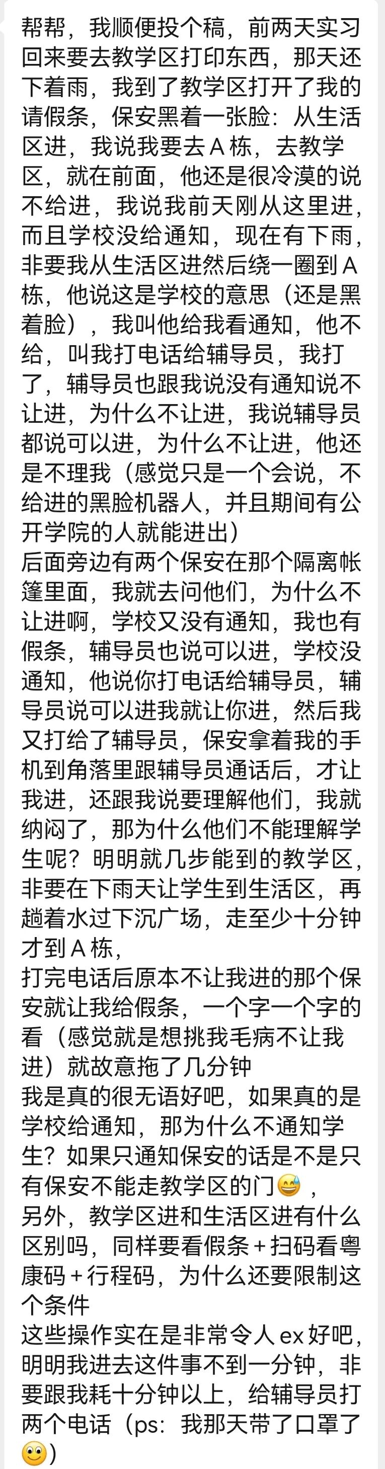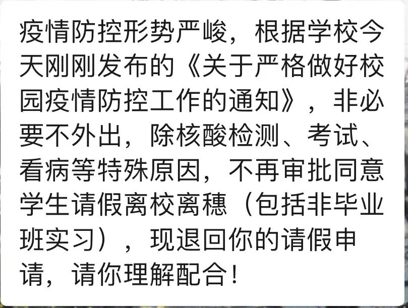 关于校门进出、核酸检测、假条审核等相关问题可以及时地通知到位,各学院之间尽量不要存在差异,门口保安、校方领导和在校学生三方之间的信息进行及时同步更新。才能使得大家团结一致,抗击疫情。早日迎来不戴口罩的日子。