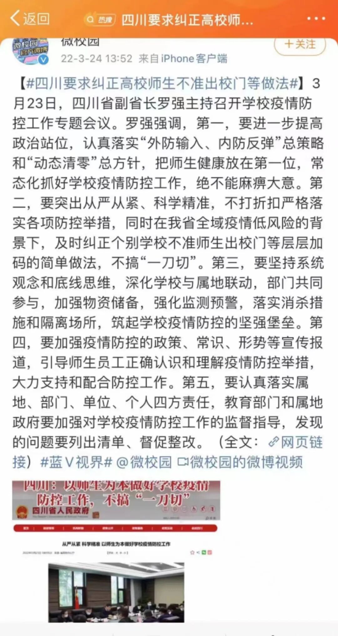 前天(3月24日)四川的副省长也召开了学校疫情防控专题会议,要求纠正高校师生不准出校门等做法