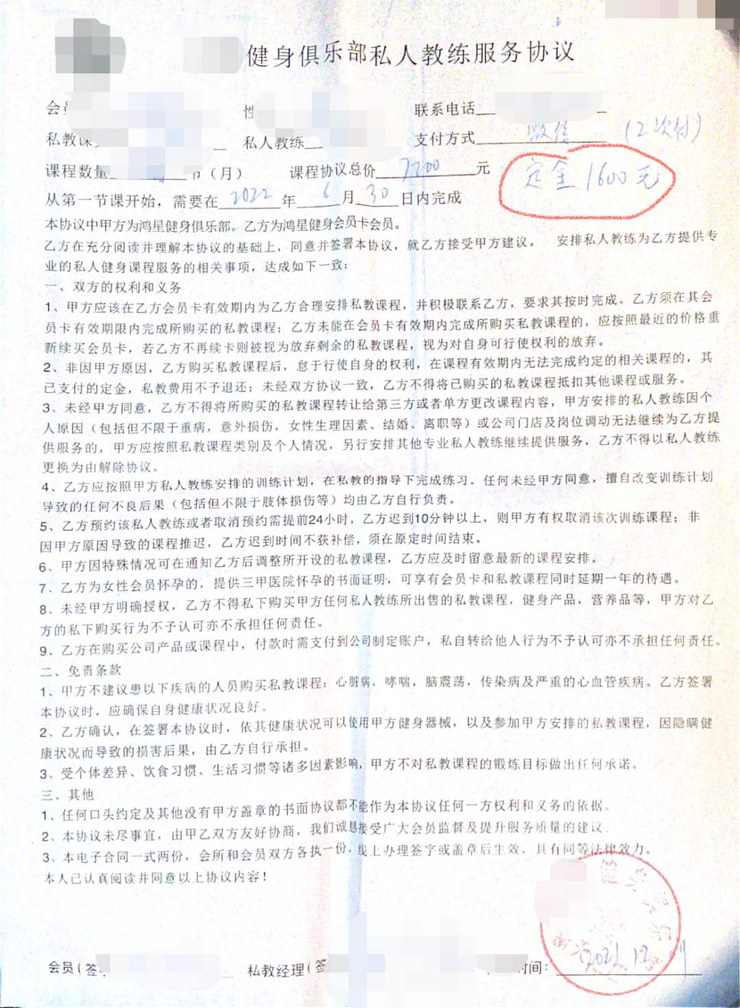 当事人签署的私教课程协议