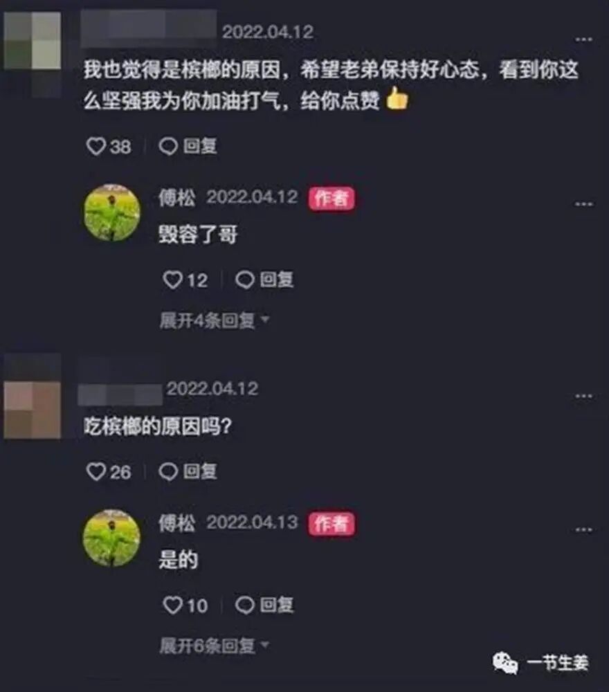 傅松在评论中回复网友,正是因为吃槟榔患癌(评论截图)