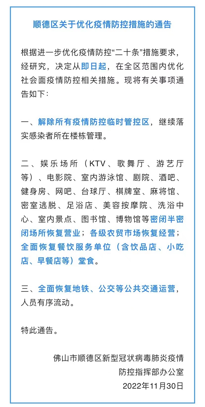 广东省佛山市顺德区新型冠状病毒肺炎疫情防控指挥部办公室11月30日发布通告显示,顺德解除所有疫情防控临时管控区,继续落实感染者所在楼栋管理。