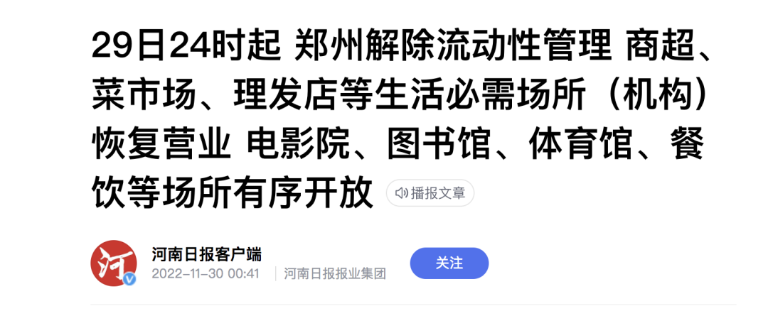 11月29日24时起,河南郑州解除流动性管理,转入常态化疫情防控。