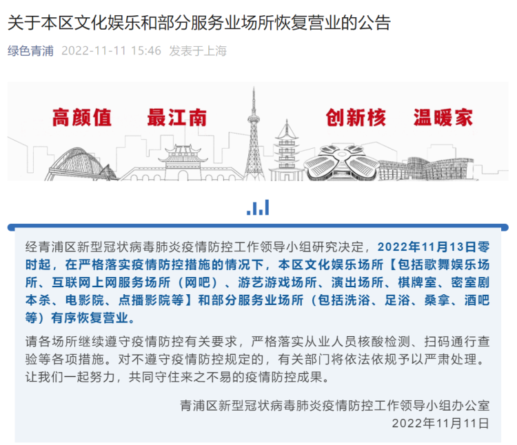 12月1日,广州市从化区发布关于调整有关场所防控措施的通告。通告称,自该公告发布起,广东广州从化区网吧、娱乐场所(KTV、卡拉OK、歌舞厅、游艺厅等)、电影院、室内体育场馆(健身房、室内游泳池、桌球厅等)、摄影楼(工作室)、酒吧、剧院、棋牌室、麻将馆、密室逃脱(剧本杀)、沐足桑拿店、美容按摩院、洗浴中心、室内景点、图书馆、文化馆、博物馆等密闭半密闭场所有序开放。