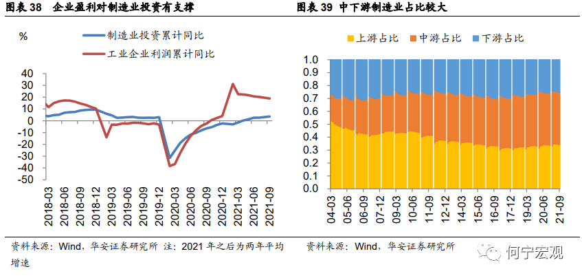 受地方隐性债务管控导致基建资金来源不足,项目审批趋严,地方政府积极性不高等影响,近年来基建投资增速整体偏低。尽管2020和2021年专项债额度较高,但由于专项债资金投向的跑冒滴漏和缺乏优质项目,上半年稳增长诉求较低,三季度疫情汛情影响施工等问题,今年以来基建投资增速仍较低。7月30日政治局会议指出“国内经济恢复仍然不稳固、不均衡”,要求“合理把握预算内投资和地方政府债券发行进度,推动今年底明年初形成实物工作量”,我们预计2022年基建投资增速高于今年,原因主要来源于两方面:一是信贷加大投放,10-11月专项债加速发行以及可能的明年专项债额度前置将使得年底年初形成实物工作量,推升今年四季度和明年一季度基建投资增速,包括前期未用完的专项债资金也可以继续投入到项目中。二是新基建、高端制造业、军工相关领域的项目需求也将对基建形成支撑。但鉴于此前制约基建的因素短期仍难切实消除,基建投资总体升幅或将有限。4.制造业:上游产能扩张继续受限,下游利润传导可能提升扩张意愿,预计制造业投资增速维持稳定今年以来受益于出口维持强劲、房地产韧性较强、企业盈利增速回升,制造业投资总体趋于改善。但下半年以来,鉴于双碳目标、“能耗双控”、“限产限电”等政策提振上游价格,侵蚀中下游企业利润,导致中下游企业投资动能不足,同时上游又受政策限制难以大规模投产扩建,制造业投资回升幅度被压制。展望2022年,碳中和政策将继续限制上游产能扩张;价格逐渐向下游传导、叠加下游消费内生性回升,中下游制造业投资有望改善。对于上游:2021年10月26日国务院印发《2030年前碳达峰行动方案的通知》,碳达峰及碳中和政策目标下,能源消费强度和总量双控制度将持续完善,对制造业上游产能扩张将形成限制。对于中下游:预计明年PPI将向CPI形成传导,PPI全年成前高后低的走势,CPI成前低后高的走势,中下游企业盈利将有所改善,但幅度可能有限。总体看,考虑到中下游制造业投资占比更大,预计2022年制造业投资继续维持稳定修复。![]()
