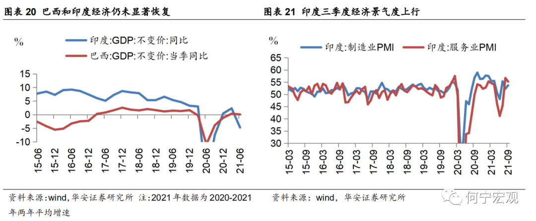 3)当前经济仍趋复苏,明年可能滞后中美欧,迎来回落。受疫苗供给不足,疫情持续影响制约,新兴经济体恢复缓慢。受疫情影响较大的巴西和印度二季度GDP两年平均增速分别较前值回落0.25和7.04个百分点至0.09%和-4.72%。往后看,随着疫苗接种率的提升,新兴市场仍将延续复苏,截至9月,印度制造业和服务业PMI分别从6月的低点48.1%和41.2%回升至53.7%和55.2%。展望2022年,随着中美欧经济动能的逐渐衰减,新兴市场复苏动能可能也将滞后迎来回落。