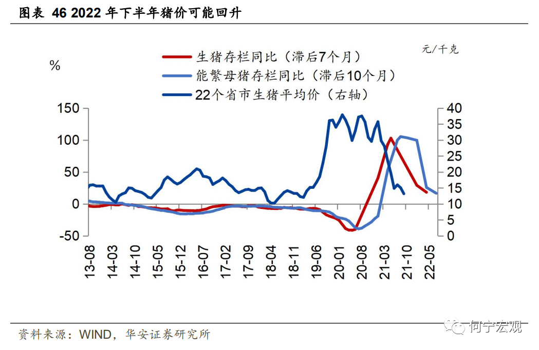 1)猪价:今年四季度至春节可能阶段性抬升,然后3-5月筑底,下半年再回升。影响猪周期最主要的因素是供给变化。一般而言,从能繁母猪在栏到生猪出栏通常需要10个月左右的时间,因此常使用能繁母猪存栏量同比领先10期对猪肉价格进行预测。但根据测算,能繁母猪存栏量同比领先5期的数据与猪肉价格同比相关系数最高。因此,实际上的领先期大概率介于5期-10期之间。鉴于能繁母猪存栏同比在今年三季度见顶,预计猪肉价格底部可能落于明年上半年。此外,猪肉价格不仅受供需影响,还具有一定的季节波动性。一般1、2月份节日期间,猪肉需求大增。因此总体看,预计2022年1-2月的猪肉价格应有回升,春节后波动下行,3-5月可能触底,2022年下半年再趋势上行。对于猪价对通胀的影响,我们首先假设生猪价格四季度至春节期间波动上升至15元/千克,然后波动下行至12元/千克左右,至2022年下半年再回升至15-20元/千克,假设猪肉占CPI权重为2.31%,则在2022年下半年月均拉动CPI环比0.1个百分点。![]()