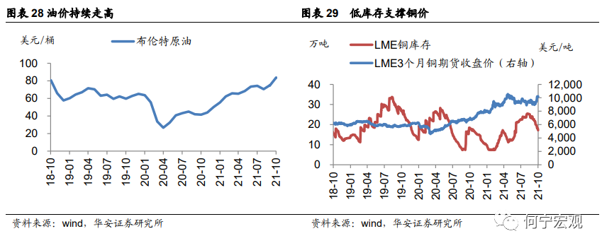 往后看,对于美国:鉴于供应链危机、劳动力短缺和工资上涨等问题短期难切实缓解,且停止购债前美国货币政策整体偏宽松,预计通胀仍将持续一段时间,经济面临类滞胀风险;不过鉴于今年基数较高,油价同比明年趋于回落,将带动美国CPI逐渐回落。对于欧元区:欧洲本轮通胀主要源于供应链“断裂”和能源短缺,正如欧央行所说,通胀比预期的持久但仍是“暂时的”,预计未来随着能源供需再平衡,价格将逐步回落。2.通胀暂时性vs长期性:预计本轮通胀明年下半年有所缓解,但长远看未来价格波动中枢或有抬升2021年以来全球大宗商品价格“一路高歌”。疫情期间各国超宽松货币政策带来充裕的流动性,疫情稳定后全球企业生产活动和居民出行、消费增加,对能源需求加大,然而与之错配的是短缺的能源供给,叠加芯片短缺、运费走高,国际大宗商品价格大幅上涨,截至2021年10月底,CRB工业原料现货指数较年初上涨26%,CRB金属现货指数较年初上涨35%。1)原油:年内维持强势,明年可能逐步回落。需求端看,新兴市场接棒复苏,冷冬和北半球能源危机增加对原油需求;供给端看,OPEC增产乏力、美国页岩油和俄罗斯原油供给短期难放量;年内原油供需偏紧格局可能难逆转,油价趋于震荡上行。展望明年,需求端有增有减,虽然天气转暖、美欧经济景气相继见顶回落、宽松政策退坡将拖累原油需求,但疫情缓和后居民出行也将部分增加对原油的需求;供给端预计增加,OPEC、美国、俄罗斯等原油供给预计逐步提升,伊朗核协议谈判如果取得实质结果,原油也将得到释放,原油供需紧张格局或将得到缓解。总体看,预计明年中旬之后油价可能上涨乏力。2)铜:当前已处于顶部区间,增长空间或已有限,但新能源相关需求的抬升和短期铜矿产能增长有限也会限制铜价下行空间。一方面,鉴于明年美联储货币政策逐步收紧、全球经济复苏动能日趋衰落,疫后供需格局改善和铜矿产能释放,预计铜价继续大幅上涨空间有限。但另一方面,新能源汽车、光伏、电缆将增加中长期铜需求,较低的全球铜矿资本开支短期内也将抑制产能的大幅扩张,预计铜价也难大幅回落。![]()