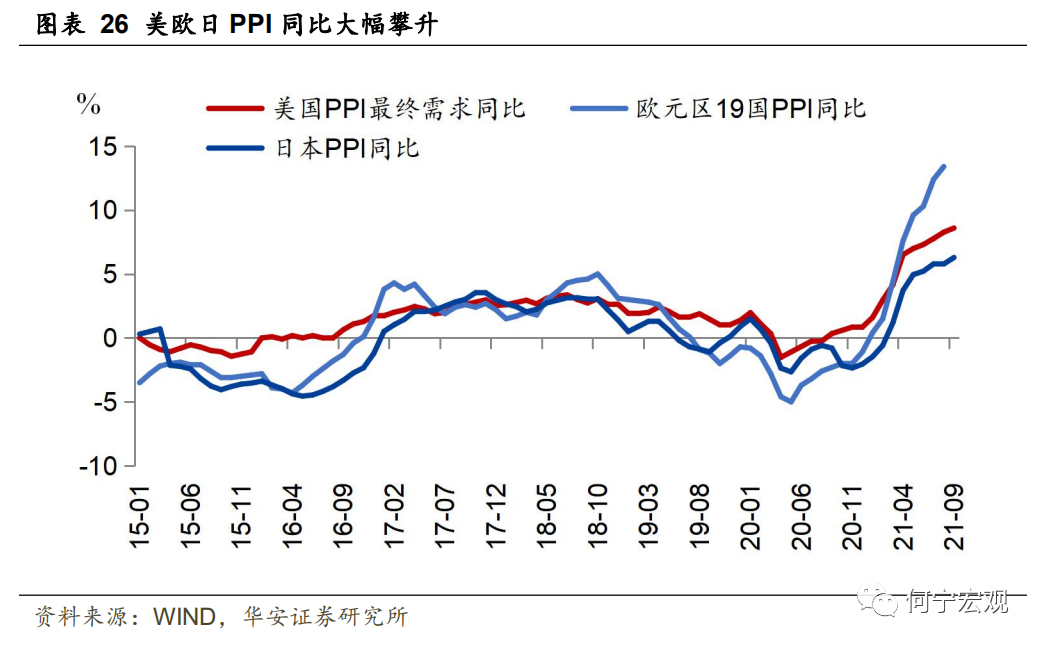 2.3 全球政策:2022年宽松逐渐退坡,各国节奏分化随着全球经济修复带来就业情况好转,通胀压力升温,全球货币政策宽松程度逐渐退坡,其中美联储逐步收紧,欧央行和日央行仍偏宽松,部分新兴市场国家已开始“抢跑”来应对通胀和货币贬值。美联储:美联储预计在年底开始缩减购债,并于2022年中结束购债,之后启动加息。截至10月下旬,联邦基金利率期货显示明年下半年美联储启动加息几乎是板上钉钉,加息时点预期也从此前的12月提到最早6月开始。若通胀持续居高不下,美联储收紧货币政策的行为可能更加鹰派,也不排除提早加息或增加加息次数。欧央行:10月28日,欧央行发布最新利率决议,维持利率和购债规模总量不变,紧急抗疫购债计划(PEPP)将于明年3月结束,并称放缓PEPP购买速度不等于缩窄。欧央行认为欧元区继续强劲复苏,通胀上升比预期持续得更久,但仍相信“通胀是暂时的”,预计2022年供应链问题将得到解决,通胀缓解,加息条件还不满足。总体看,欧央行态度较为温和,欧元区经济复苏程度不及美国,因此需要更长时间的宽松政策刺激,加息进度将慢于美联储。日本央行:10月28日日本央行最新利率决议提出保持当前货币政策宽松力度,维持利率不变,并下调2021财年经济增长预期至3.4%。因此,当前尚看不到日央行收紧,日央行行长甚至重申“如有必要将毫不犹豫推出进一步宽松措施”。新兴市场:为应对通胀上升,资本外流和汇率贬值等压力,新兴市场开始“抢跑”,纷纷加息,例如俄罗斯、巴西、墨西哥、土耳其、智利等国。以巴西为例,截至10月27日,巴西进行了年内第六次加息,上调基准贷款利率至7.75%,这可能进一步加剧巴西经济的脆弱性。2.4全球通胀:暂时性和长期性问题共存,国家和商品间存差异,总体看,2022年下半年全球通胀有望得到缓解1.全球各国通胀:全球通胀普遍走高,短期仍维持高位,2022年将逐步缓解2021年以来全球通胀普遍走高。分国家看:截至2021年9月,美国CPI同比稳定在5.4%的高位,核心CPI同比虽较6月高点有所回落,但仍为4%,创1992年以来新高;欧元区HICP同比上涨3.4%,已经超过2%的政策目标,核心HICP同比1.9%;日本通缩压力缓解,9月CPI同比12个月来首次由负转正至0.2%。同时,各国PPI同比上涨更加明显,截至2021年8月,美国、欧元区、日本PPI同比分别录得8.3%、13.4%、5.8%的高位。![]()