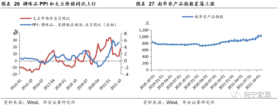 综上所述,食品、服装和交通工具方面PPI向CPI传导效果较好。10月调味品企业纷纷宣布涨价,主要和原材料、人力、运输成本上涨有关。大豆市场价当月同比上升17.15%,高于前值的7%,而大豆是酱油制作中较为重要的原材料,因此酱油率先涨价。根据南华农产品指数持续上涨的态势,我们认为需警惕食品类价格普遍上行。
