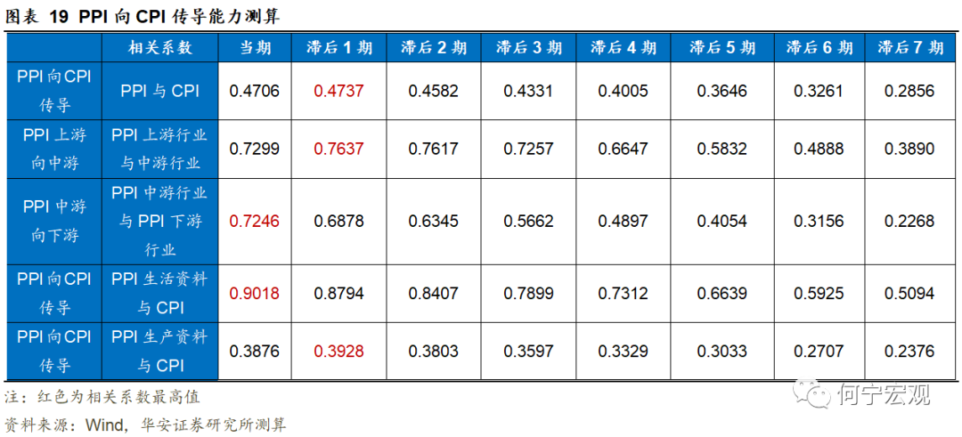 第一,总体看PPI对CPI的影响。测算显示,滞后一期的PPI当月同比与CPI相关性最强,但也仅有0.4737。这表明整体看PPI与CPI的相关性较低。