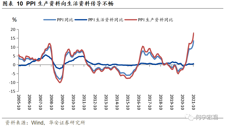 10月PPI生产资料和生活资料涨幅差距持续扩大,PPI生产资料同比扩大3.7个百分点至17.9%,但生活资料同比仅扩大0.2个百分点至0.6%。PPI生产资料-生活资料增速差由9月的1.5%扩大至3.2%,意味着价格传导仍然有限。