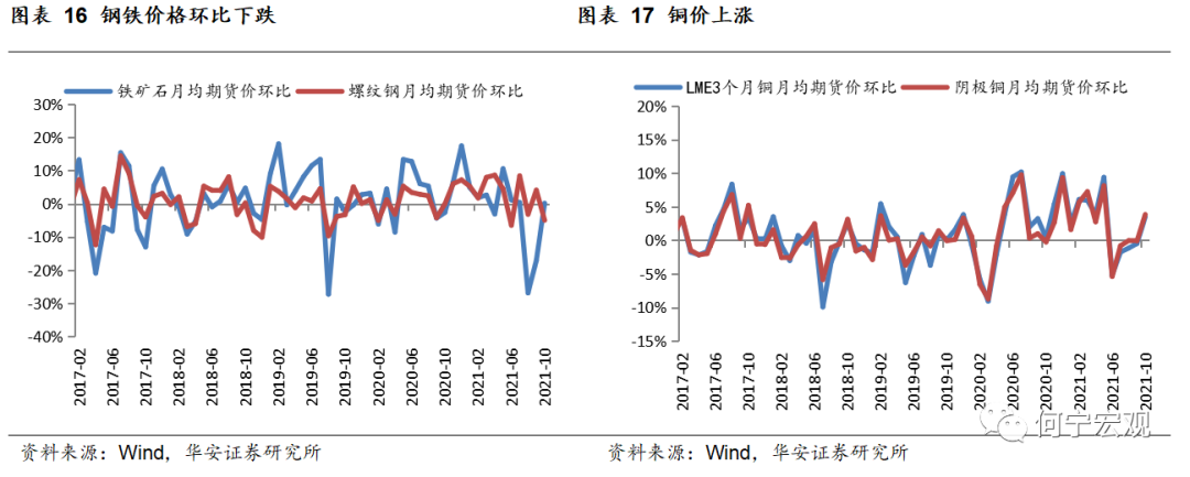 钢价下跌拖累黑色链价格。10月疫情多点复发,叠加地产需求下滑,螺纹钢价格环比下降5%,带动PPI黑色金属矿采选业环比下降8.9%。