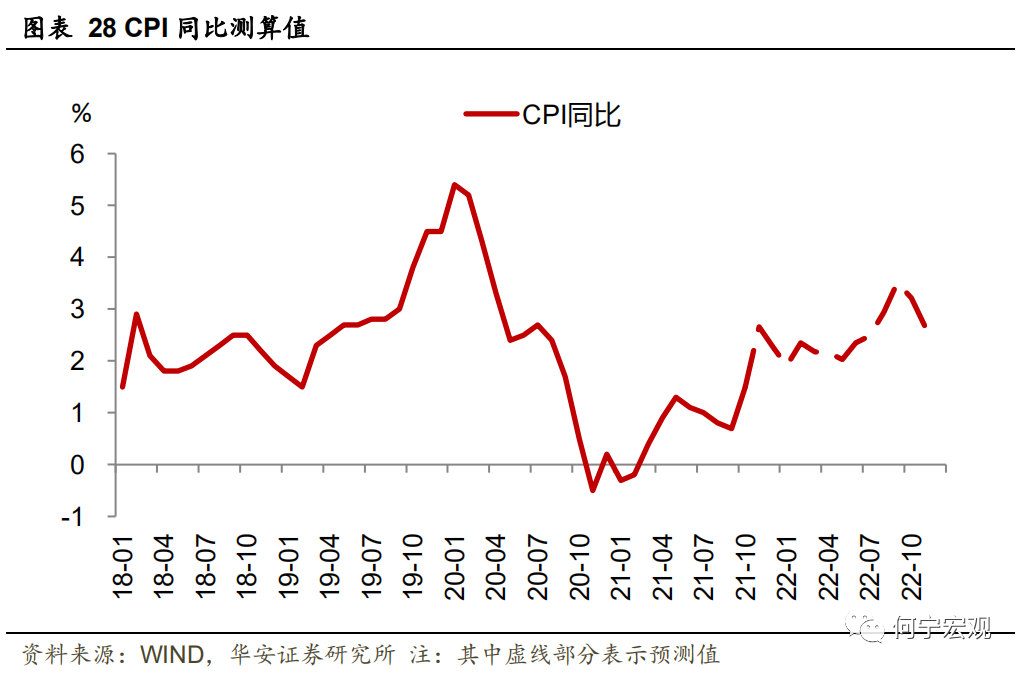 展望明年,我们调高对CPI的预期,综合考虑CPI环比的季节规律、2022年下半年猪价上行、油价年中之后上涨可能乏力、电价对CPI的影响,预计CPI同比在2021年12月回落,2月春节再次阶段性上涨,然后再次回落,至下半年再逐渐升高至3%-4%。全年累计同比可能从今年的1%左右升至2%-3%。