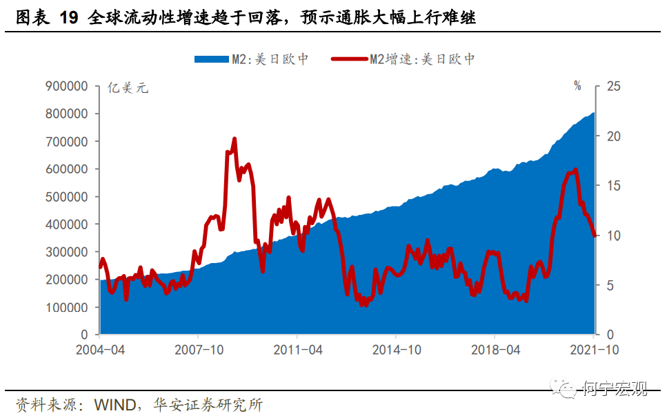 1)全球货币政策宽松程度逐渐退坡。其中美联储逐步收紧,欧央行和日央行仍偏宽松,部分新兴市场国家已开始“抢跑”来应对通胀和货币贬值。通胀本质上是货币行为的滞后反映,从流动性来看,美日欧中M2增速今年以来持续下滑,从年初的16.6%降至10月的10.0%,通胀继续大幅上行的概率不高。