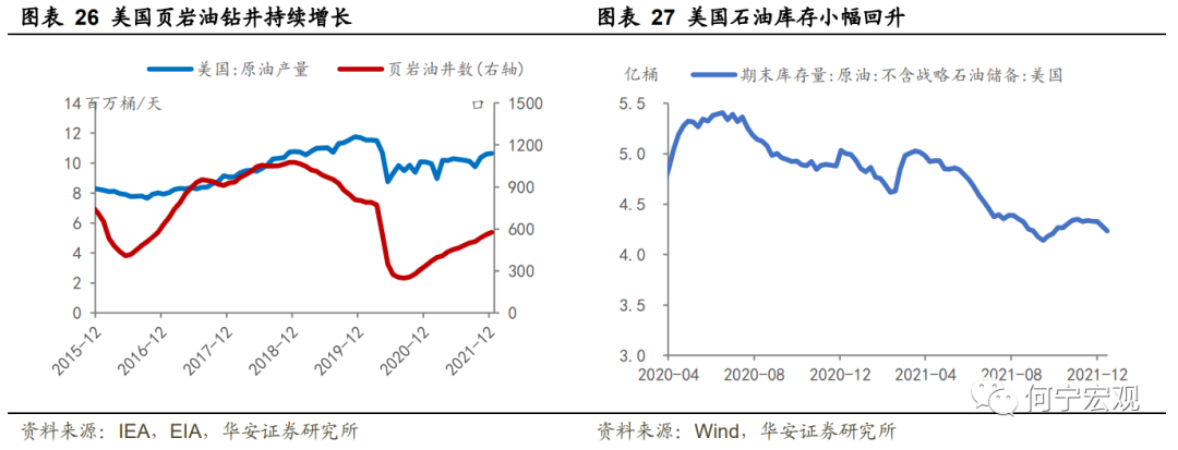 石油:截至三季度,全球石油供给较疫情前水平仍差510万桶/天,石油需求差290万桶/天,前三季度供需缺口稳于110万桶/天。供给端,一方面OPEC有序增产,11月实际增产36万桶/天,12月OPEC+产量会议决定明年1月增产40万桶/天;另一方面,白宫多次敦促油企增产,美国新钻页岩油井自2021年初以来稳步增长,石油产量升超100万桶/天,石油库存小幅回升。考虑到奥密克戎扩散削弱全球经济增长动能,同时阻滞欧美通航时点、抑制油品需求,预计明年石油供需缺口将进一步收窄,EIA预测2022全年缺口将收窄至53万桶/天。