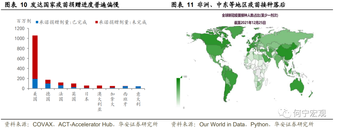 2)发展中国家与发达国家“疫苗不平等”。根据杜克大学统计数据,目前制造商全球每月生产约15亿剂,至2021年底全球疫苗产能约110亿剂,至2022产能将超过200亿剂。尽管COVID-19疫苗制造商在疫苗生产方面达到了前所未有的规模,一个冰冷的现实在于即使明年疫苗规划产能过剩,发展中国家可能依然无法获取足额疫苗资源。一方面,发达国家疫苗捐赠执行不力,发达国家为海外提供疫苗援助不足甚至是拒绝提供,截至11月29日,“新冠疫苗实施计划”(COVAX)仅向144个国家和地区交付4.99亿剂新冠疫苗,远低于其原本预期的12亿剂疫苗,美国承诺提供11亿剂次的捐赠但目前履行比例不足20%,英国、日本、加拿大和澳大利亚完成比例仅为26.2%、18.8%、29.6%和0%。另一方面,发达国家疫苗严重过剩,却不愿意在分发上考虑发展中国家。截至2021年12月14日,高收入国家交付疫苗23.1亿剂次、疫苗存货44.7亿剂次,其覆盖100%人群完全接种仅需23.8亿剂次,过剩比例87.7%,而中低收入国家尚在40%覆盖率上挣扎。全球范围内提升免疫水平、构建免疫网络是对抗新冠病毒的根本手段,疫苗分配不平等导致部分地区接种比例偏低,为病毒“变异”提供了空间。第二轮疫情周期中的印度和第四轮周期中的南非皆为印证。