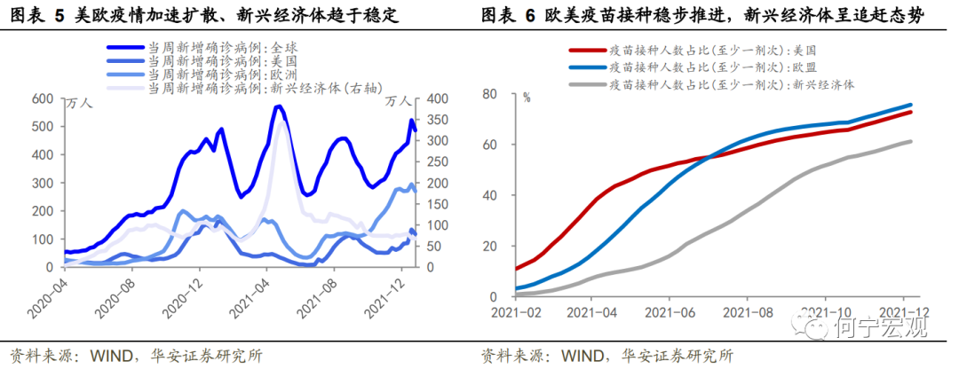 疫苗接种:欧美疫苗接种稳步推进,新兴经济体快速追赶。欧美从去年12月启动疫苗接种,领先新兴经济体约2个月。12月欧美疫苗接种比例(至少一剂次)分别为76.6%和73.7%,在接种比例超过60%后增速明显放缓。新兴经济体后发效应显著,几乎呈直线式进行追赶,12月疫苗接种比例(至少一剂次)升至61.4%,其中印度、巴西、韩国、南非接种比例分别为59.7%、77.5%、85.4%、31.3%。