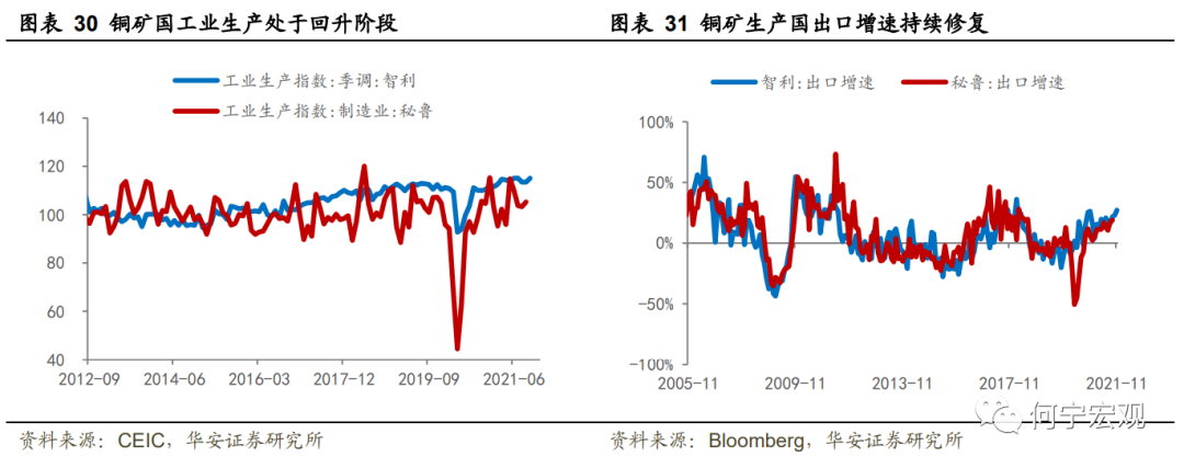 铜:二季度以来,海外铜矿山运营逐步恢复,主要供给国智利和秘鲁在疫情管控、工业生产、铜矿供给均有边际修复。截止2021年12月22日,智利当周新增确诊人数约0.9万人,至少接种一剂新冠疫苗的人数占比89%,于12月10日检测发现3例奥密克戎;秘鲁当周新增确诊人数约1.1万,至少接种一剂新冠疫苗的人数占全国总人数的72%。南美较高的疫苗普及率有助于抵御新型变种。工业生产方面,10月智利工业生产指数为103.96,9月秘鲁工业生产指数为105.3,均处于回升阶段。铜矿出口方面,智利11月出口金额49亿美元、出口数量约51万吨,量价并进。尽管两国近期采取封锁措施,推迟了陆地边界的重新开放,但奥密克戎不会形成较大冲击,明年铜大概率供需缺口收窄。