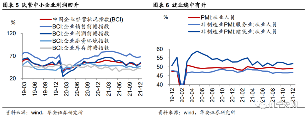 1)供给整体延续修复,但受12月淡季影响,修复速度减缓;需求略有改善,但仍偏弱,内需稍好于外需。供给端,12月PMI生产为51.4%,较前值回落0.6个百分点。一方面,能耗双控放松,发改委“保供稳价”政策下,工业生产延续修复,PMI生产连续2个月在荣枯线以上,高频数据显示12月秦皇岛港煤炭库存平均为498万吨,低于11月的546万吨,但高于9-10月的390和420万吨;另一方面,随着天气转冷,12月工业生产进入淡季,PMI生产较11月环比小幅减弱,高频数据显示,截至12月第四周,高炉开工率为46%,低于11月底的48%;化工行业PTA开工率也较11月下降。需求端,12月PMI新订单、新出口订单分别较上月回升0.3和回落0.4个百分点至49.7%、48.1%,整体仍处于较低位置,其中PMI新订单连续5个月低于荣枯线,PMI新出口订单连续8个月低于荣枯线。根据统计局,医药、汽车、计算机通信电子设备等行业新订单景气度较高。此外,PMI进口回升0.1个百分点至48.2%,连续7个月低于荣枯线。由此看,12月需求略有回暖,但仍偏弱,PMI新订单和PMI进口回升,而PMI新出口订单回落,反映内需稍好于外需。