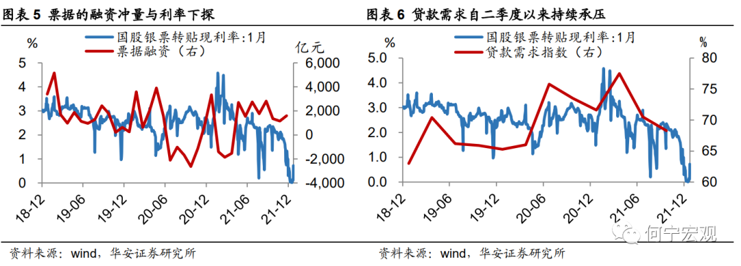 2)资金供给端,全面降准与结构性工具“量价结合”,货币政策稳中有松,维持合理充裕。2021年7月和12月两次降准、碳减排支持工具、3000亿支小再贷款、煤炭清洁专项再贷款、下调支小、支农再贷款利率等货币政策调整为市场释放了较为充足的流动性。在此背景下,考虑到实体融资需求较弱,商业银行扩表意愿不足,银行可能会通过主动提升票据贴现规模来满足监管要求,同时客观上也对存单和国债形成了一定的替代。这从11月以来票据利率与同期存单、国债利率发生背离也能得到印证。因此,票据利率的超季节性下降也反映了经济下行压力下信贷资金存在供需缺口。