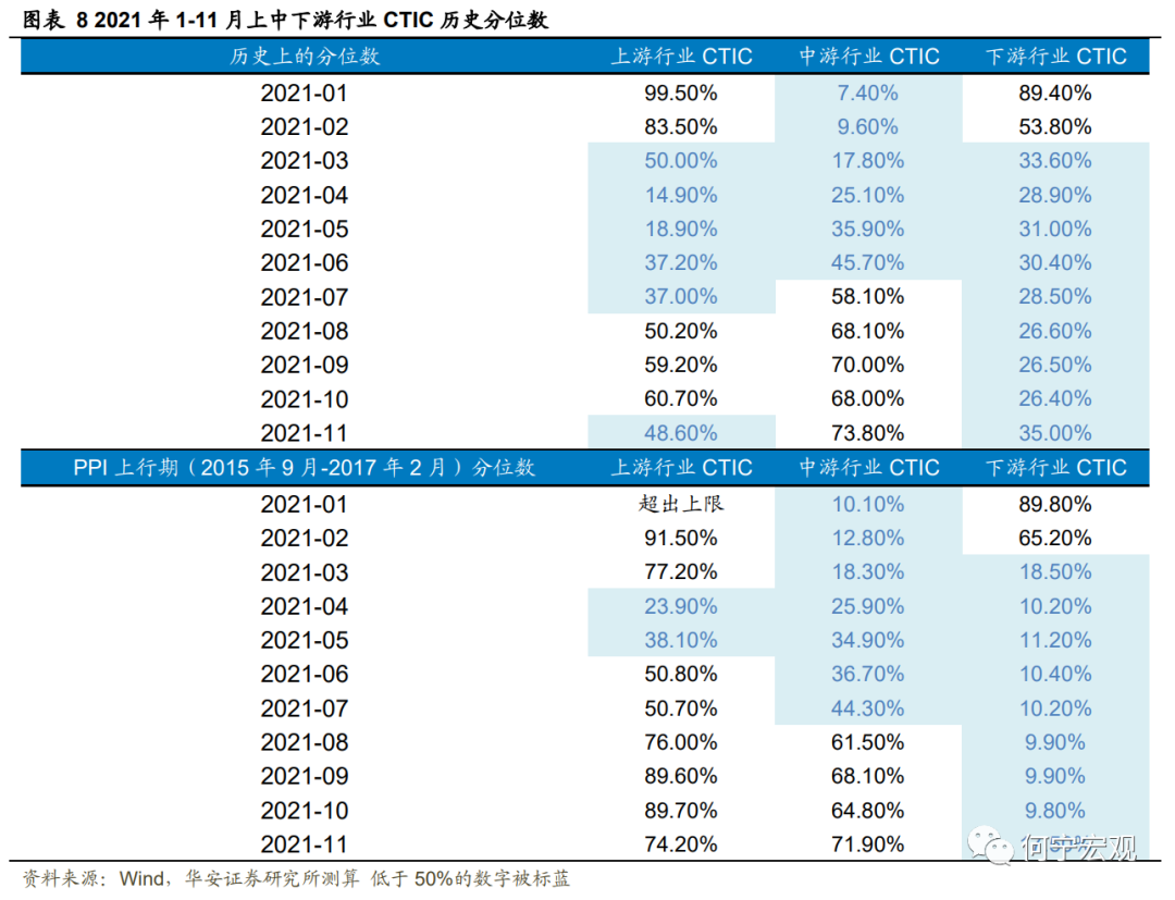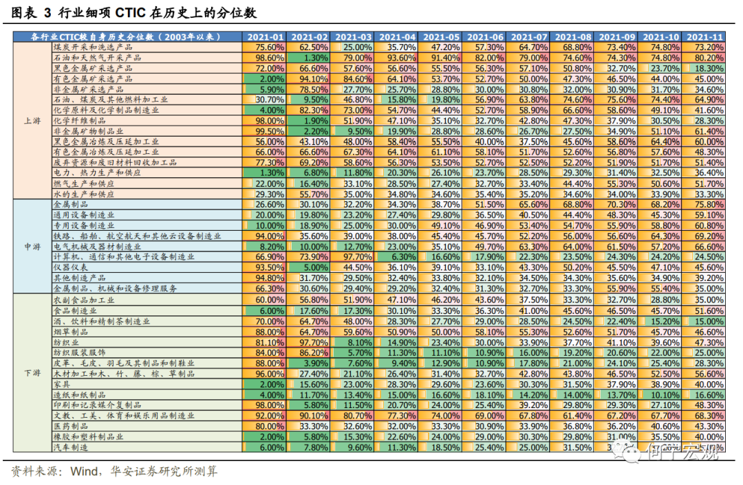 进一步地,为衡量各行业当前成本传导能力在历史上的水平,我们测算各行业CTIC在2021年1月-11月的历史分位数,如下表所示。