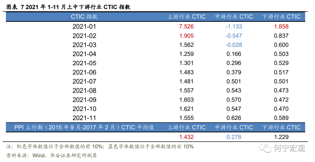 分上、中、下游CTIC看,2021年上游行业价格传导能力更强,且强于2015-2017年PPI上行期;中下游行业价格传导能力弱,且下游行业价格传导能力弱于2015-2017年PPI上行期。图表7展示了上中下游行业CTIC指数,处于2021年所有月份的上中下游CTIC指数前10%的数值被标红,后10%被标蓝。整体来看,依然是上游行业的价格传导能力占据优势,且2021年上游行业的CTIC指数整体高于2015-2017年PPI上行期的CTIC指数均值;中游行业的CTIC指数在2021年1-11月呈上升趋势,大部分时间高于2015-2017年PPI上行期的均值;下游行业的CTIC指数在2021年1-11月先降后升,低于2015-2017年PPI上行期的均值。因此,与上一轮PPI上行期平均水平相比,上游行业价格传导更强,下游更弱。
