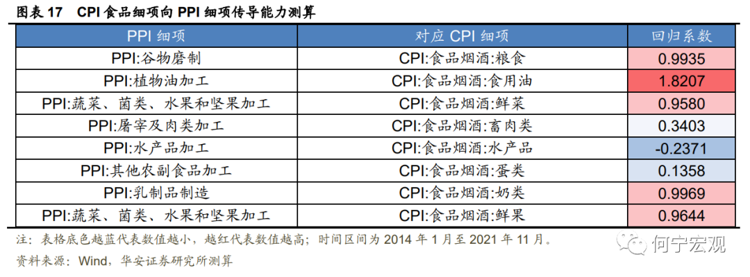 2.中类行业传导:PPI中类向CPI传导并非全局性的,呈现出结构化特点,回归系数较高的行业为烟草制品、计算机等电子设备制造、医药制造、纺织服装服饰、水生产和供应、印刷业等行业,这些行业PPI上升可能导致消费品涨价。