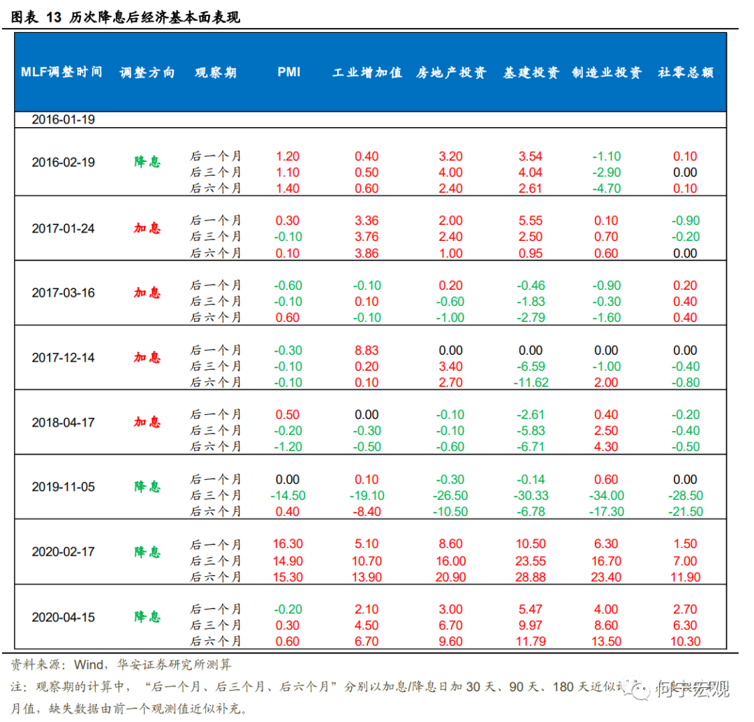 经测算,2016年以来4次MLF降息后经济通常趋于好转,供给和需求均有改善。需要指出的是,这一规律在2019年11月的降息中并不明显,短期刺激效应有限、一季度后甚至出现下滑,这主要源于2020年初的疫情冲击,此处不做重点考虑。总体看,降息后经济有两大特点:第一,相较于供给端,扩张性的货币政策对需求端的改善更为显著,表现为降息后投资和消费的改善程度总体优于工业增加值;第二,需求内部来看,投资改善幅度高于消费,且反应也更为迅速,其中基建投资涨幅最大。