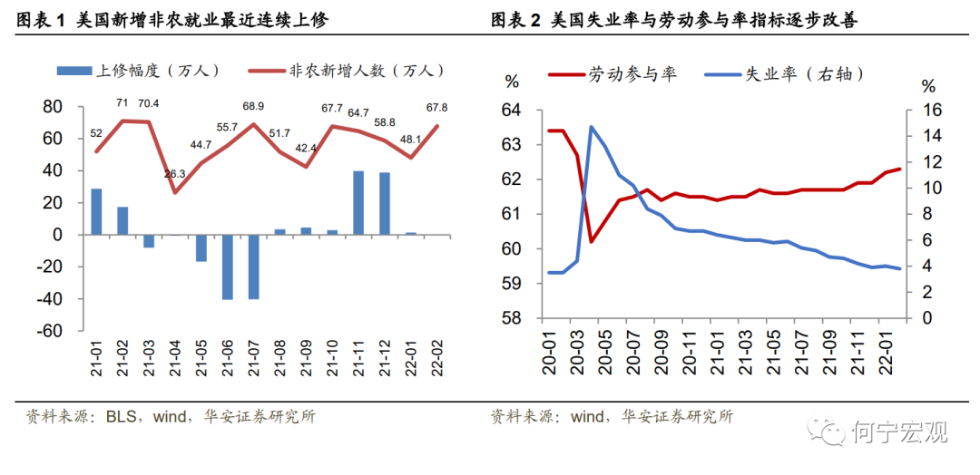 1.美国2月非农数据显示美国劳动力市场正在快速修复,各项指标较上月都有改善。其中新增非农就业人数从上月的46.7万人上升至67.8万人,并对2021年12月份与2022年1月份就业人数进行了上修。上修后两个月累计就业人数较之前报告高9.2万人,大幅增加。失业率从上月的4.0%下降至3.8%,劳动参与率则从上月的62.2%小幅上升至62.3%。从去年下半年以来,美国的新增就业人数、失业率以及劳动参与率等数据不断改善,而且几乎每月就业数据都会得到一定程度的上修,显示当前美国劳动力市场相当强劲,或已达到美联储政策目标中的充分就业状态,加息的必要条件已达成。