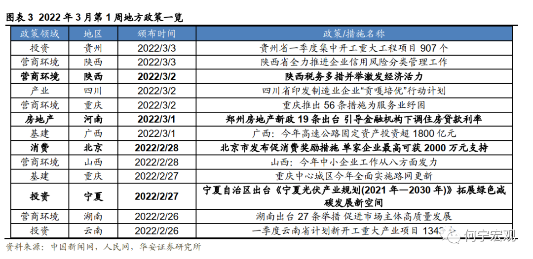 本周(2月26日-3月4日)地方政策方面,营商环境优化和基建投资仍是主旋律:其中山西、陕西、四川、重庆等省份出台措施保市场主体平稳发展,郑州下调住房贷款利率。具体来看,颁布的政策参见如下表格。摘录重点内容如下: