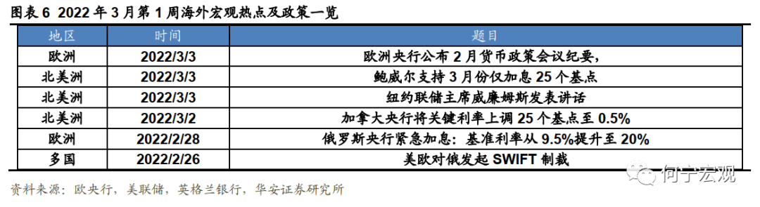 本周(2月26日-3月4日)海外宏观方面,本周海外央行货币政策全面收紧,为应对卢布贬值,俄罗斯央行紧急加息1050基点,美联储加息近在咫尺,货币政策开启正常化。摘录的重点内容参见以下表格: