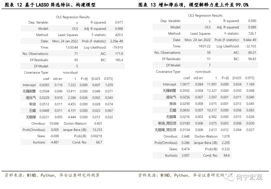 在LASSO回归中我们筛选出了9个与PPI同比高度相关的因子,可进一步构建线性回归方程,剔除不显著和具有共线性的因子后,我们保留了无缝钢管、柴油、汽油、石蜡、无烟煤5个变量,模型解释力度R^2为97.1%。