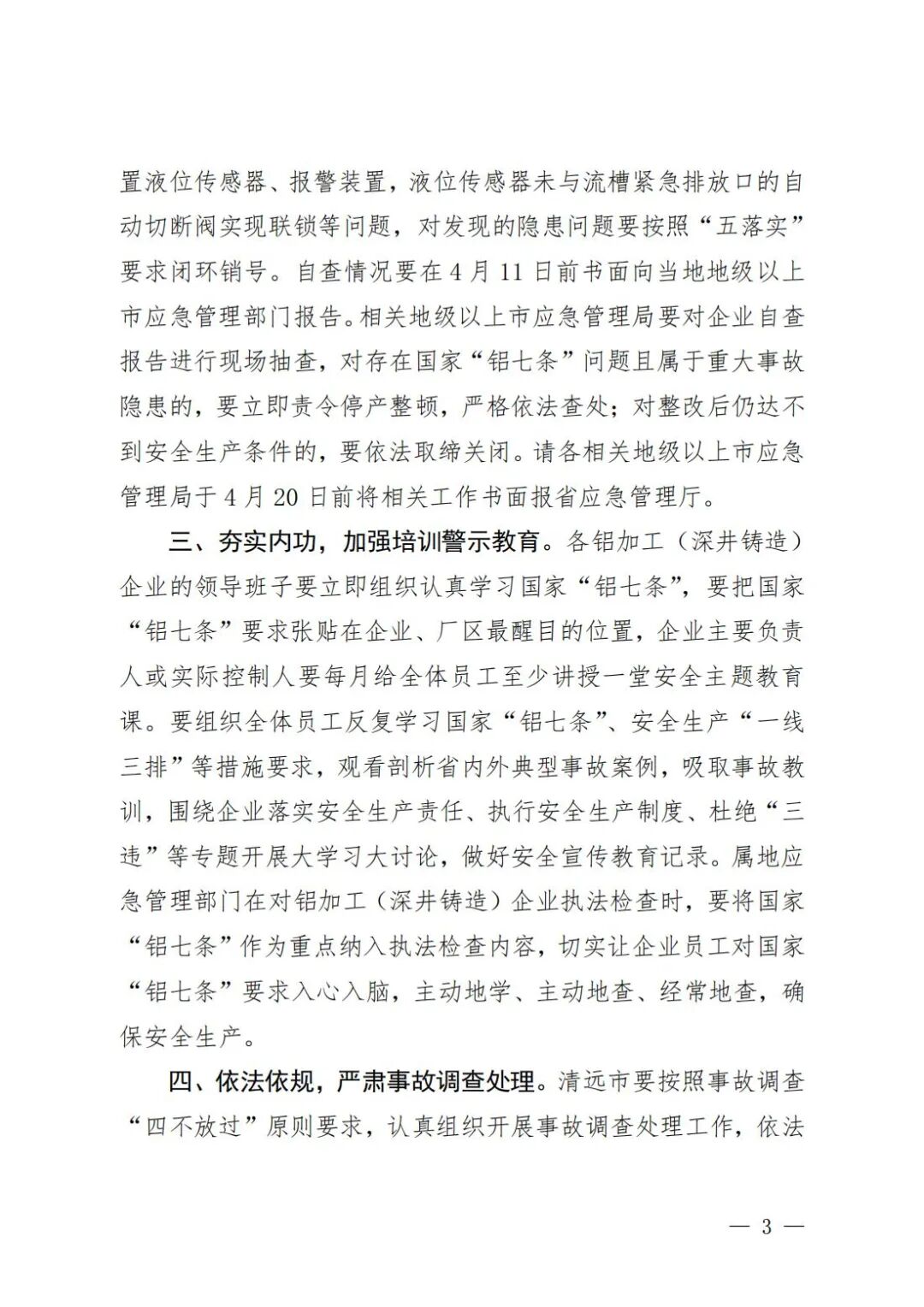 我局将继续督促广东省应急厅做好事故原因的调查分析,并及时将事故情况发送至全国工贸安全监管工作群,提醒各地吸取事故教训,严格按照“铝七条”对铝加工(深井铸造)企业执法检查,坚决遏制同类事故再次发生。