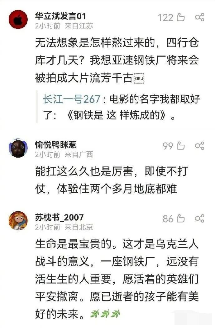 没错,亚速钢铁厂的乌克兰守军真的成功撤离了俄军的包围圈,完成了这军事上近乎于不可能的事情,而且乌克兰甚至还能做到分批撤离,第一批先撤200多人。我真的无法想象他们是怎么撤出俄军包围圈的,但确实成功撤离了,连撤离画面都播出来了。整个欧美媒体都将亚速钢铁厂的撤离行动称之为“二战之后最成功的一次特种营救行动。”“乌克兰结束了马里乌波尔的战斗任务,宣布战士们已经撤退。这标志着亚速钢铁厂的战斗结束”