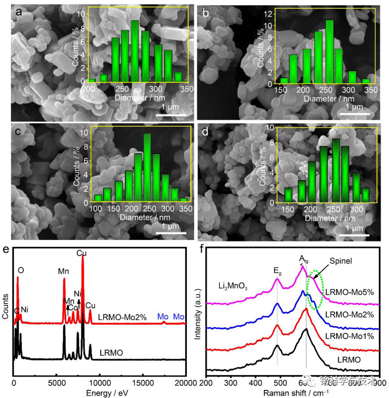 图3a-d为LRMO 、LRMO-Mo1.0%、LRMO-Mo2.0%和LRMO-Mo5.0%的SEM图像。Mo掺杂后,高度结晶的颗粒均匀分布,所有样品平均粒径分布约 200-350纳米范围内。EDS分析(图3e)表明,Mo元素在共沉淀过程中成功地引入了LRMO的晶格中。由图 3f 拉曼光谱显示表面,LRMO-Mo2.0%和LRMO-Mo5.0%样品出现了尖晶石相特征峰。