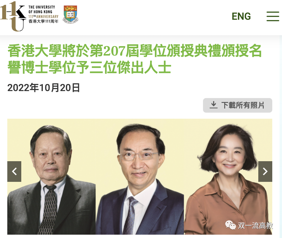 公告指,杨振宁教授因重要科研成果获得国际殊荣和奖项无数,其超卓成就亦备受全球24所大学认同,香港大学向杨振宁教授颁授名誉科学博士学位,以表扬其在学术界及全球的重大贡献。林高演博士为香港小轮(集团)主席、恒基兆业地产有限公司副主席、香港中华煤气有限公司及美丽华酒店企业有限公司董事,具超过48年银行及物业发展经验,香港大学向林高演博士颁授名誉社会科学博士学位,以表扬其在学术界及全球的重大贡献。此外,香港大学由于看重林青霞过往对社会的贡献,将授予林青霞名誉社会科学博士学位。林青霞近年淡出影坛后化身为作家,目前已出版4本“林氏”散文集,包括《窗里窗外》(2011)、《云去云来》(2014)、《镜前镜后》(2020)及《青霞小品》(2022)。2022年,其第3本著作《镜前镜后》获得“第十六届香港中文文学双年奖”散文组推荐奖。据悉,名誉博士学位是香港大学颁发给个人的最高荣誉,是该校的一项优良传统,地位尊崇。获此荣誉的多为对社会及世界的思想、社群及文化方面有宝贵贡献的人士,以及对大学、本地社会或学术方面有杰出贡献的人士。香港大学是中国香港的一所综合性国际化公立研究型大学,校训为 “明德格物” ,对应拉丁文为Sapientia Et Virtus。 学校奠基于1910年3月16日,次年3月30日正式注册成立,其前身为香港西医书院,是香港历史最悠久的高等教育机构。自1912年3月11日正式开学,到1916年12月举行首次毕业典礼。1948年4月9日后,学校秩序重建与结构转型并举,步入高速发展的黄金时期。2021年9月,与深圳市合作共建香港大学(深圳)。香港大学自创校以来始终采用英语教学,其学术研究多可与欧美无缝对接、良性互动,也得益于此,在很长一段时间里,以医学、商科、人文、政法等领域见长的香港大学都是中国高等教育界一面独特的旗帜,享誉亚洲乃至世界。香港大学在 2023 QS 世界大学排名第21名,在中国位居清华大学和北京大学之后,居第3名;在 2023 泰晤士高等教育世界大学排名位居 31 名,中国第 3 名;2023 USnews 世界大学排名第 76 名,中国第 3 名;在 2022 软科世界大学排名 96 名,在中国与华中科技大学并列第 8 名。来源:中新网、香港大学、双一流高教