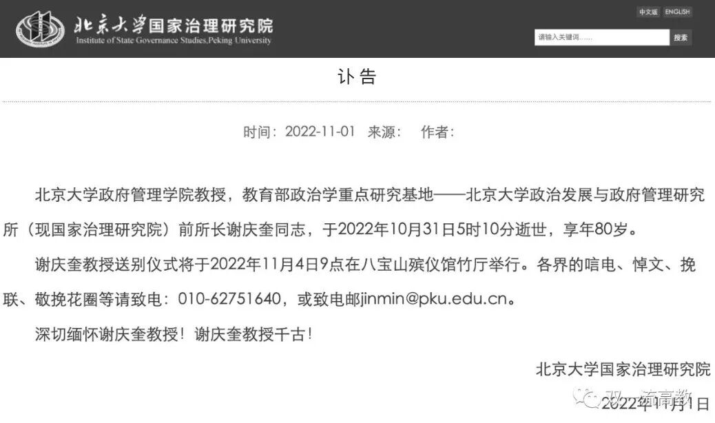 10月31日、11月1日,北京大学政府管理学院、北京大学国家治理研究院分别发布讣告:北京大学政府管理学院教授、教育部政治学重点研究基地——北京大学政治发展与政府管理研究所(现国家治理研究院,目前该院官网主页已设置为悼念模式)前所长谢庆奎教授,于2022年10月31日5时10分逝世,享年80岁。