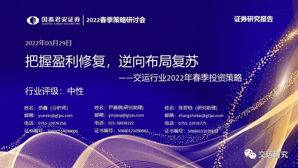 国君交运团队从事交运卖方研究十余年,坚持独立客观、深度研 究。连续十一年上榜新财富,多次获评金牛奖、水晶球、第一财经第一名。