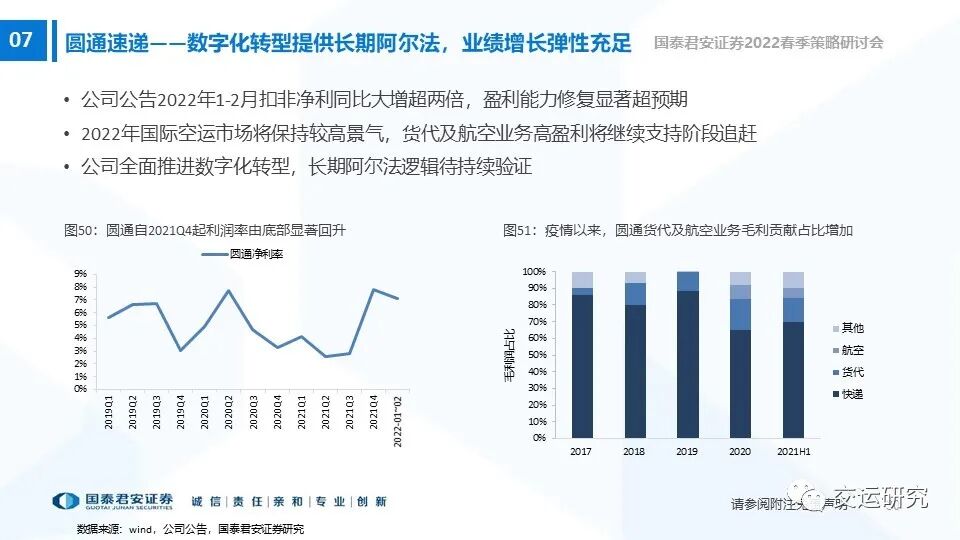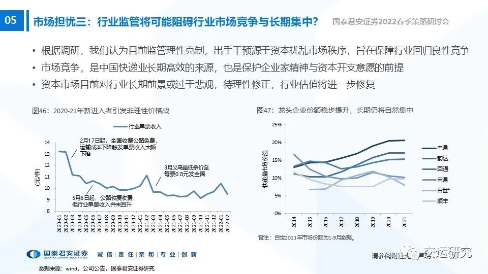 2022年行业竞争阶段趋缓,盈利能力修复确定。上半年板块性业绩高增长,弹性有望超预期,建议增持。短期疫情油价等,不改盈利修复趋势。市场或过度担忧短期价格战再起与行业监管长期影响。我们看好行业长期回归良性竞争与自然集中。维持中通快递、圆通速递、韵达股份“增持”。受益标的顺丰控股。