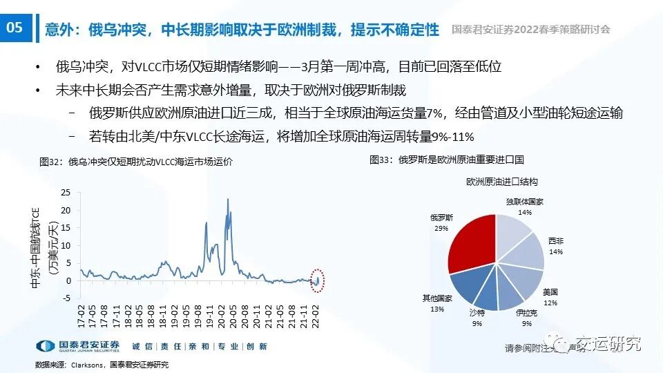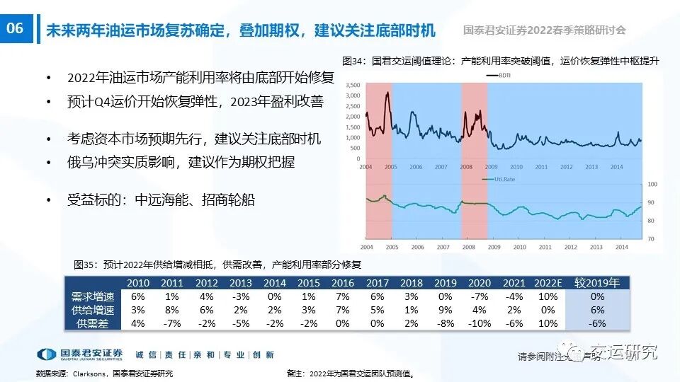 过去22个月完成供需寻底,未来两年复苏趋势确定。需求,将随原油消费回升而滞后加速恢复。供给,环保政策将加速运力出清。建议把握底部时机,俄乌冲突提供期权。受益标的中远海能、招商轮船。