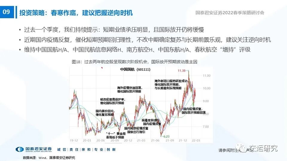 2022上半年建议把握疫情复苏与业绩增长两条投资主线,逆向增持航空、油运、快递。